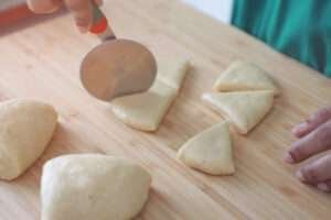 Cut each circle into 6 triangles and fry in hot oil.