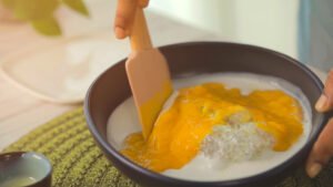 Mix the cooked sago pearls with Coconut milk, condensed milk and the heaped mango puree. You can add in vanilla essense if needed.