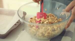 Add the liquid ingredients into the oats mixture and coat everything thoroughly.